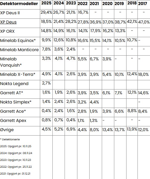 I det danske detektormiljø, og især i detektorklubberne, er der en håndfuld detektormodeller, som langt de fleste bruger.